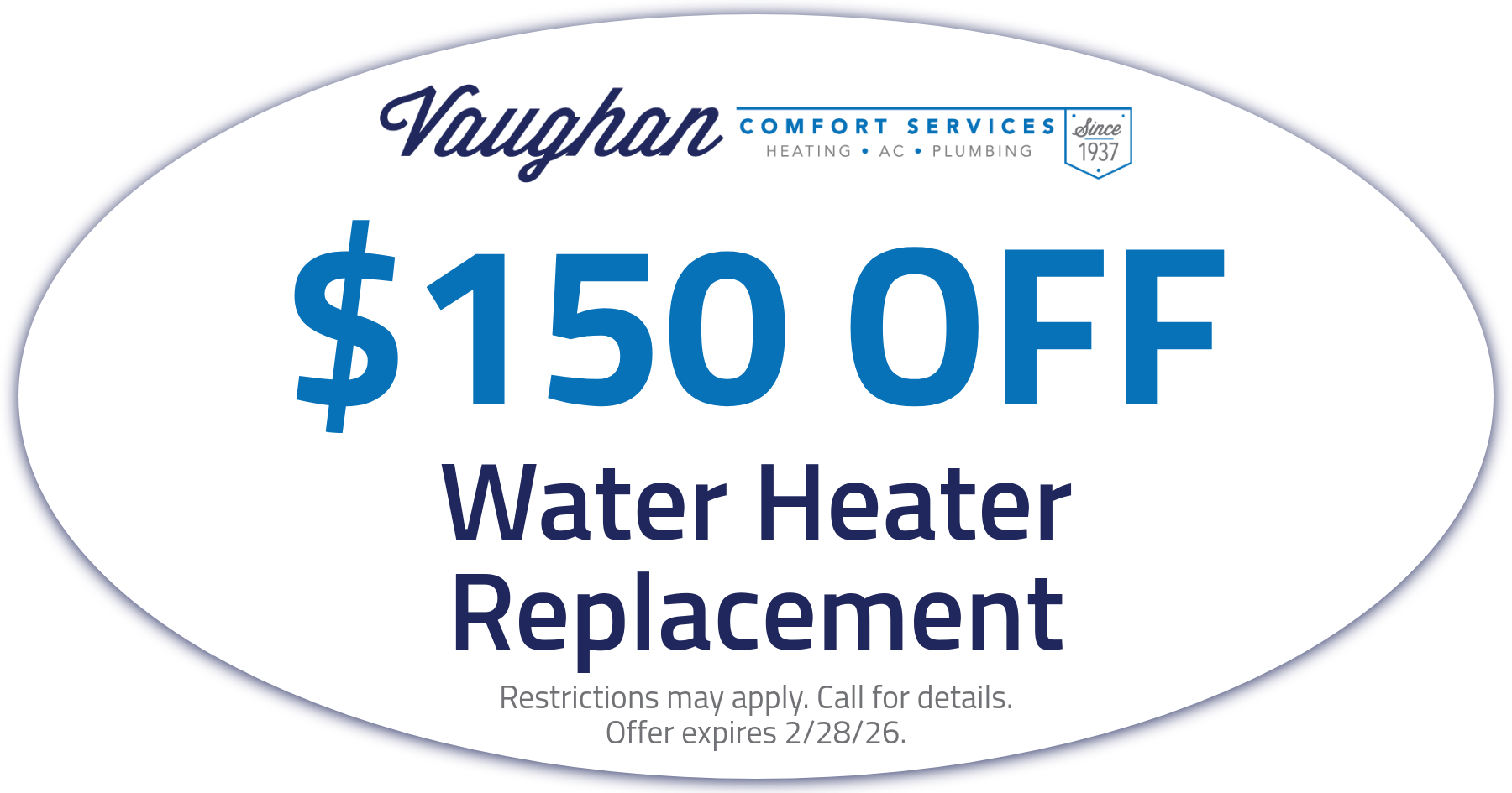 Vaughan Comfort Services" logo, offering "$150 OFF Water Heater Replacement" in bold blue text. Expires 2/28/26.